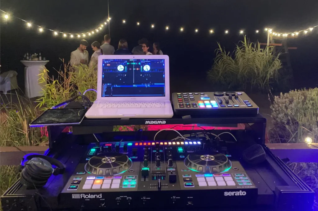 Wir bringen das komplette Equipment mit. Von der hochwertigen Soundanlage bis zur atmosphärischen Beleuchtung der Tanzfläche. Wir kümmern uns um den technischen Ablauf, abgestimmt auf eure Location.